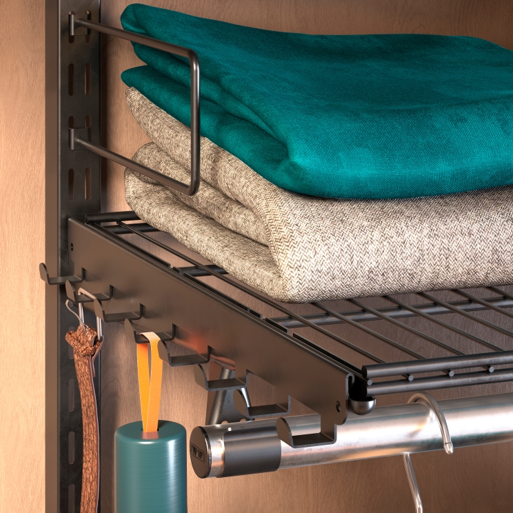 Она идеально подходит для хранения ремней, галстуков, шарфов, курток и других предметов одежды, обеспечивая порядок и быстрый доступ.Конструкция представляет собой металлическую планку с 6 или 8 крючками (в зависимости от модели), которая навешивается на внешнюю боковую поверхность кронштейна в гардеробной системе ПРАКТИК HOME.