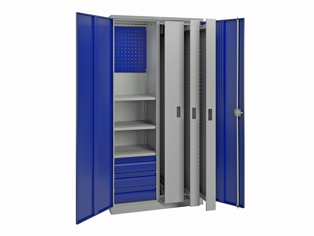 Шкаф инструментальный ТС-1995-1103031 от производителя ПРАКТИК в Казани можно купить в нашем интернет-магазине "Защита офис" по цене 73 610 руб. Внешние размеры товара - 1900x950x500. Общий вес изделия - кг. Цвет товара Cерый полуматовый (RAL 7038), двери синие (RAL 5002). Изделие имеет Порошковое покрытие.